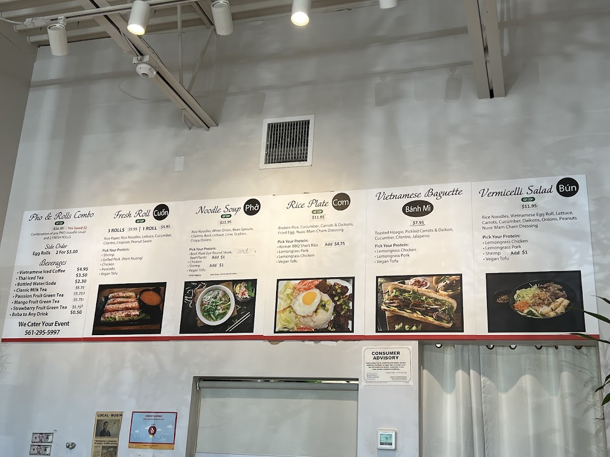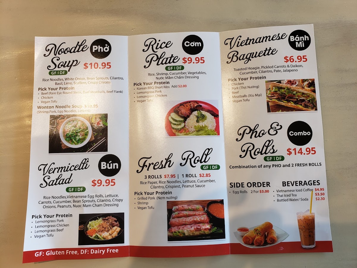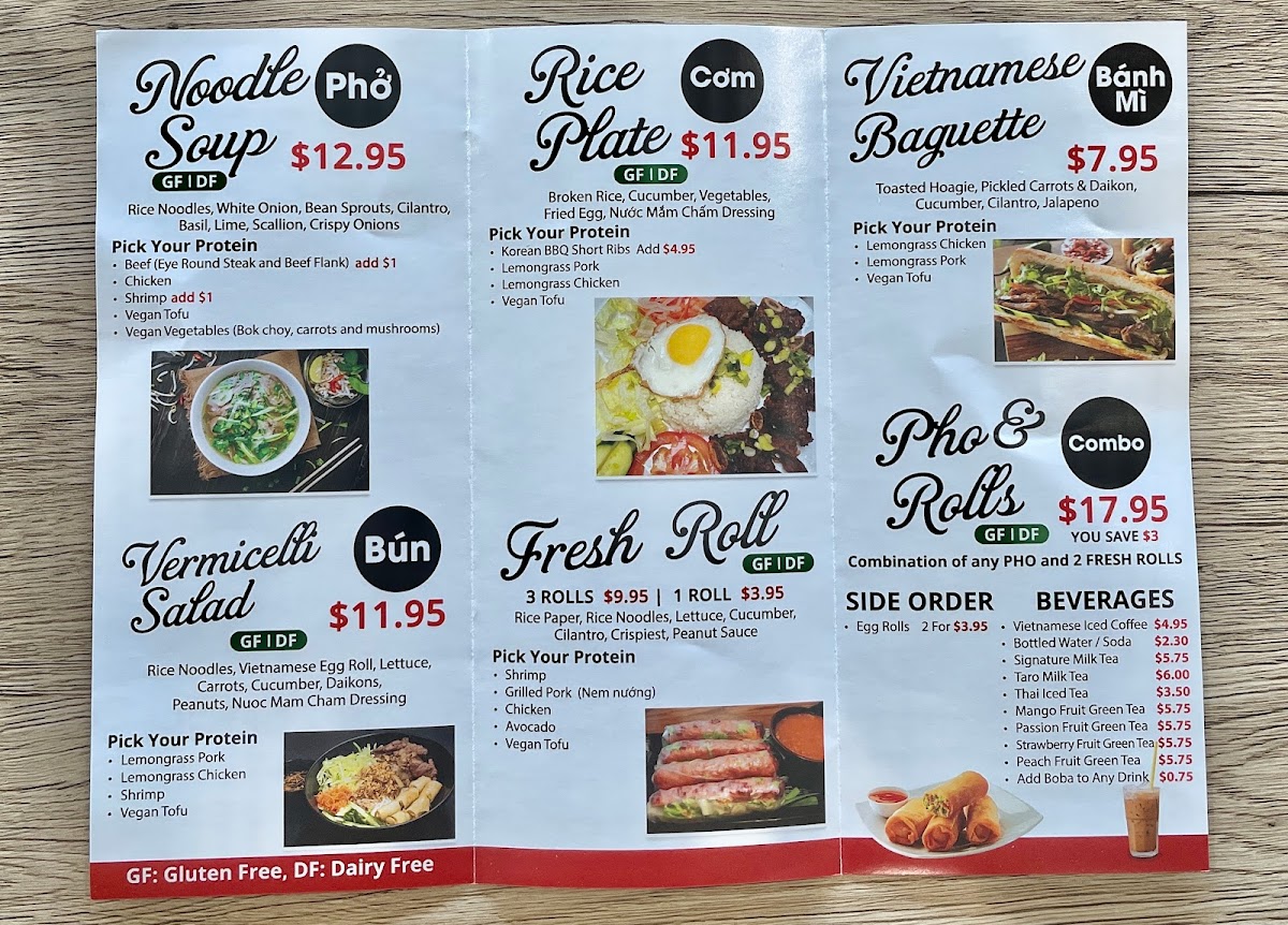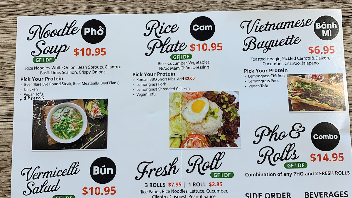 The menu offers a variety of Vietnamese dishes centered around traditional noodle soups, fresh spring rolls, and Vietnamese baguette sandwiches known as Banh Mi. It is structured to provide options for light meals, casual dining, and beverages suitable for any time of day.