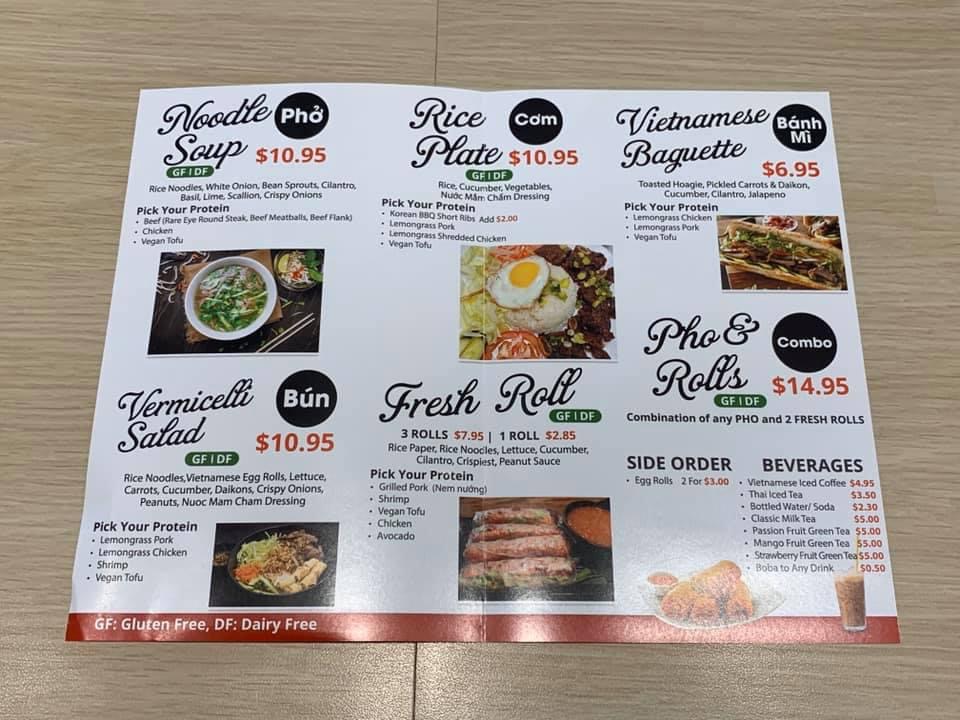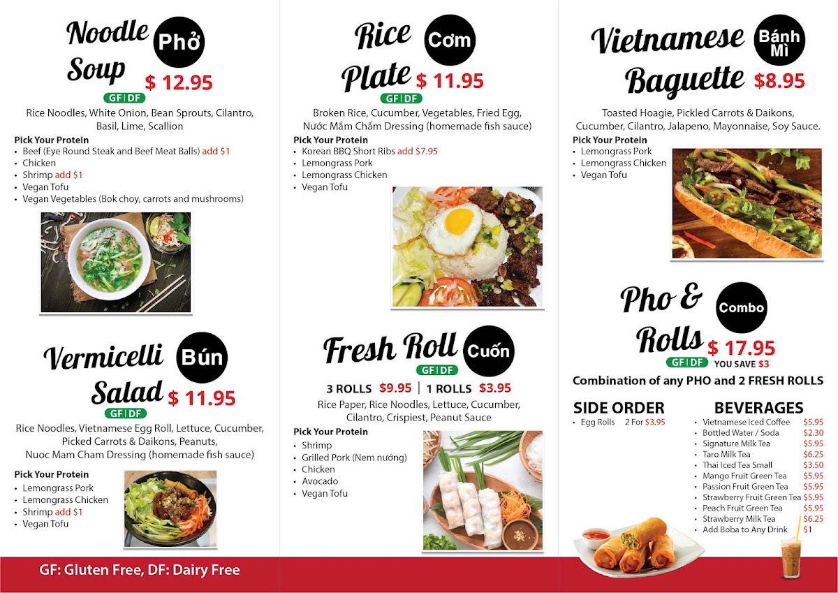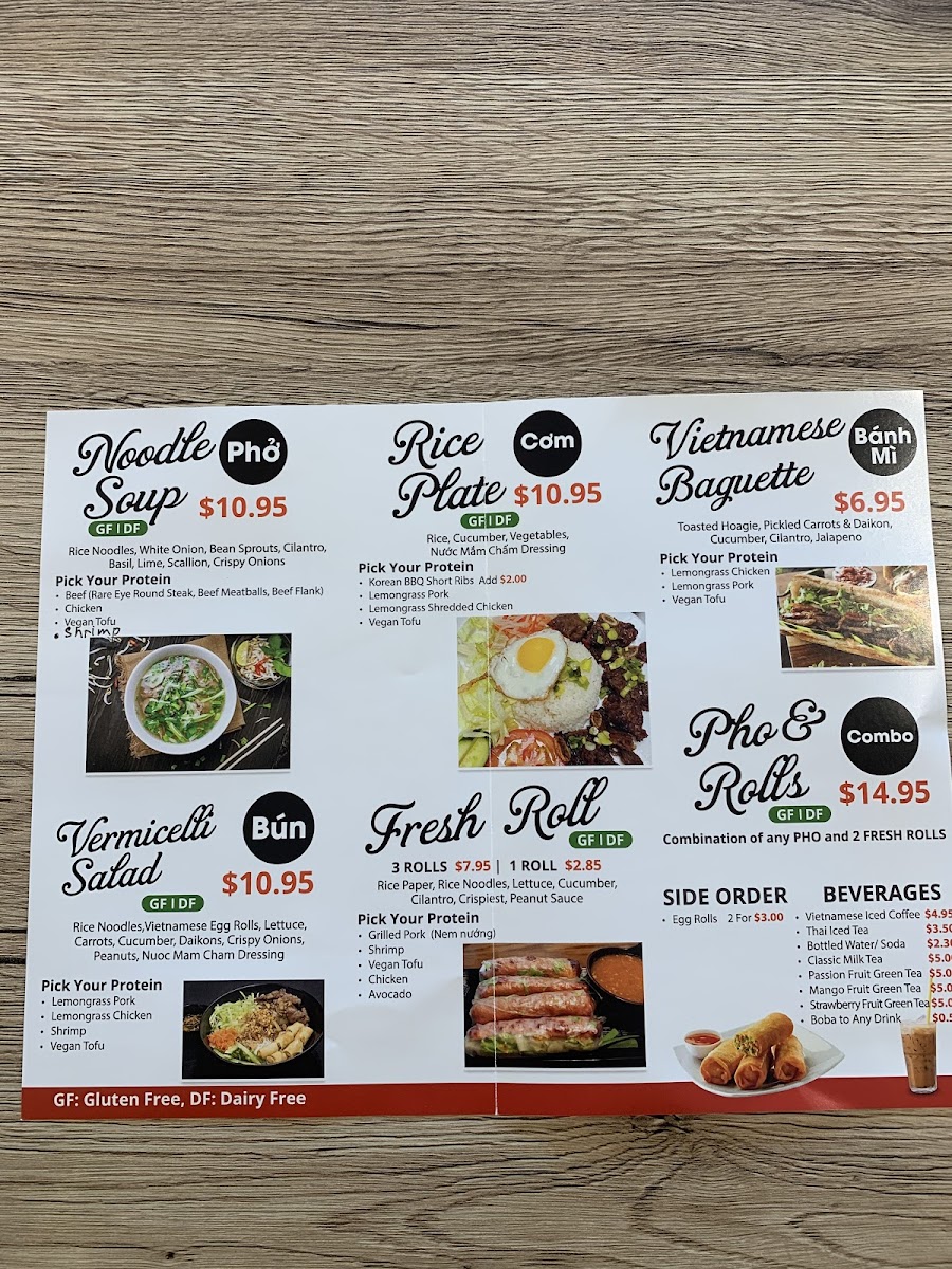 This menu accommodates quick orders as well as casual dining experiences, with selections appropriate for lunch, dinner, or a beverage break. It caters to those seeking traditional Vietnamese flavors delivered through both familiar and fusion-style dishes.