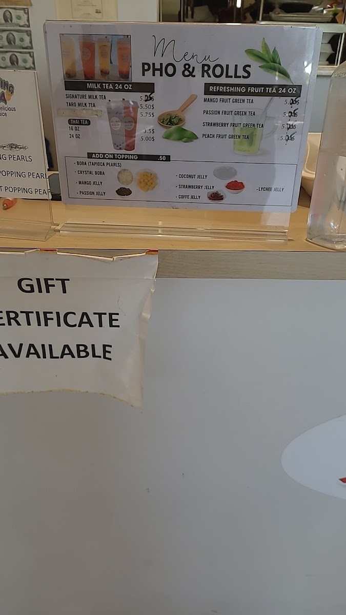 - Beverages: A variety of drinks including Vietnamese iced coffee, Thai iced tea, classic milk tea, fruit-infused green teas, and sodas. The option to add boba to any drink is also provided.